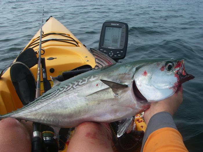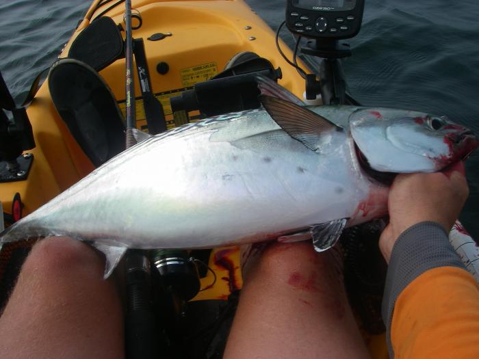 Like Walter said they were there scattered though there is some bait there may hold them for a little. I hooked up with one that snapped off on my light stick, and the one I landed I took while trolling a small white rapala that I bought for such an occasion. I was actually just staring to chase a school and as soon as I got some speed BAM off goes the drag it put on a real good showing of itself it was the fattest one I ever took from the yak for sure. The wind picked up and made looking for them impossible, will see what tomorrow brings weather wise. On a side note first respectable fish from the new yak hope that will bring me some luck- Bob